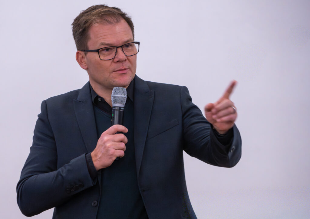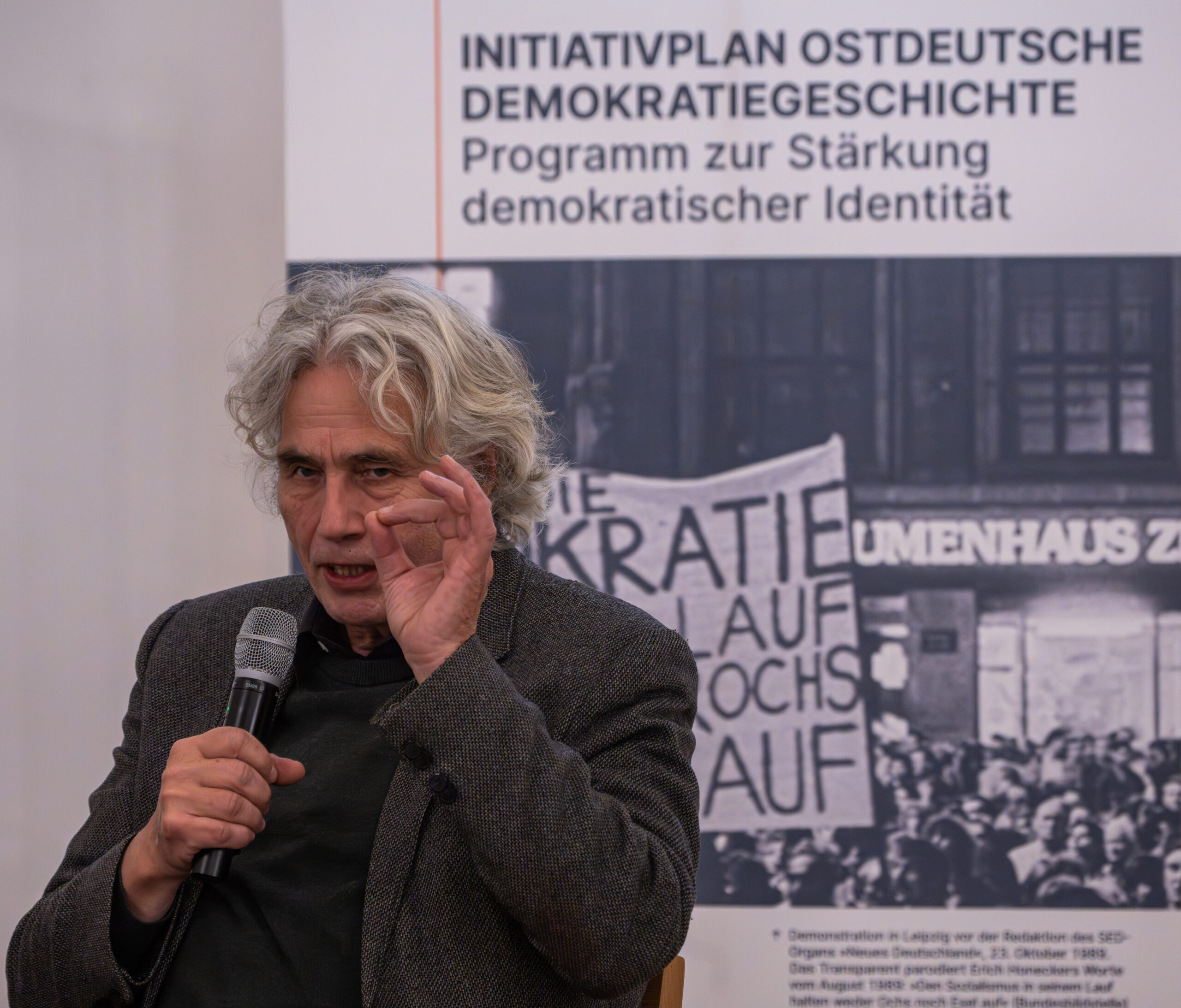 Titelbild: Stephan Hilsberg in der Podiumsdiskussion zur Geschichte und Relevanz des Zentralen Runden Tisches an seinem ersten Tagungsort mit Nine-Christine Müller, Juliane Baruck und Gesine Oltmanns, 4. Dezember 2024 (Christian Faludi/GEDG)